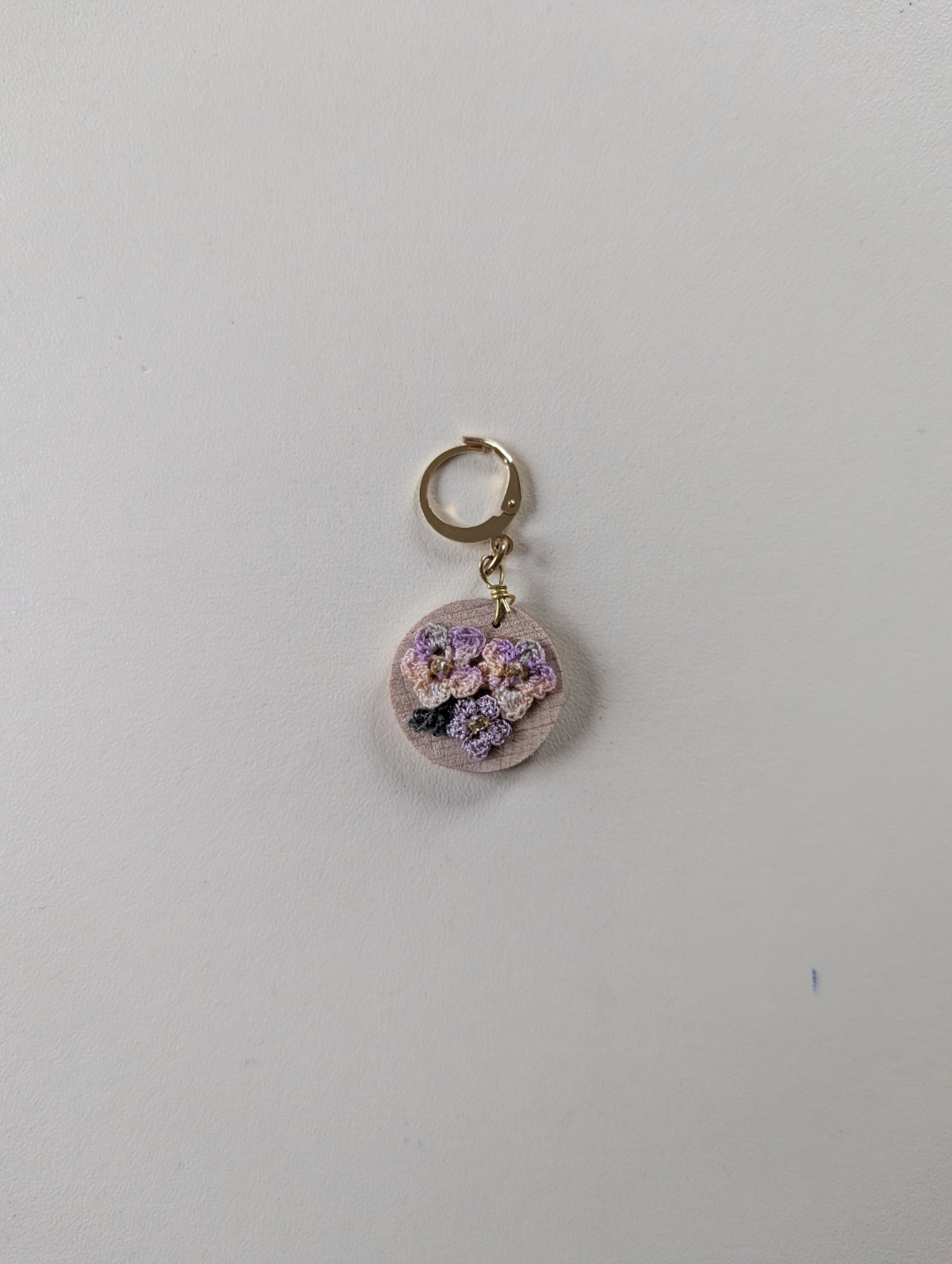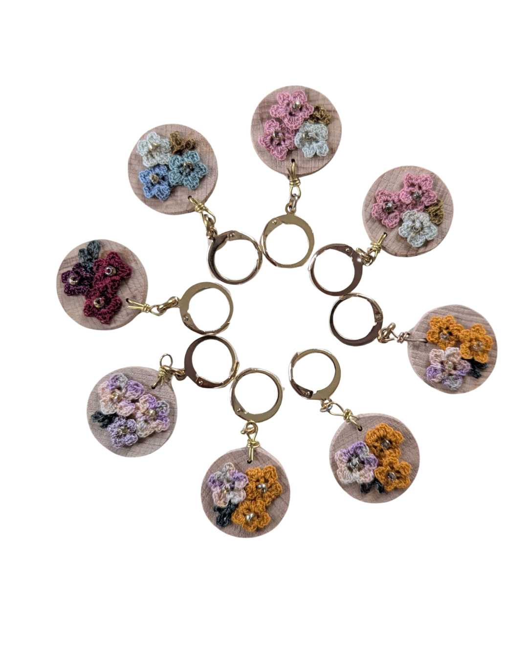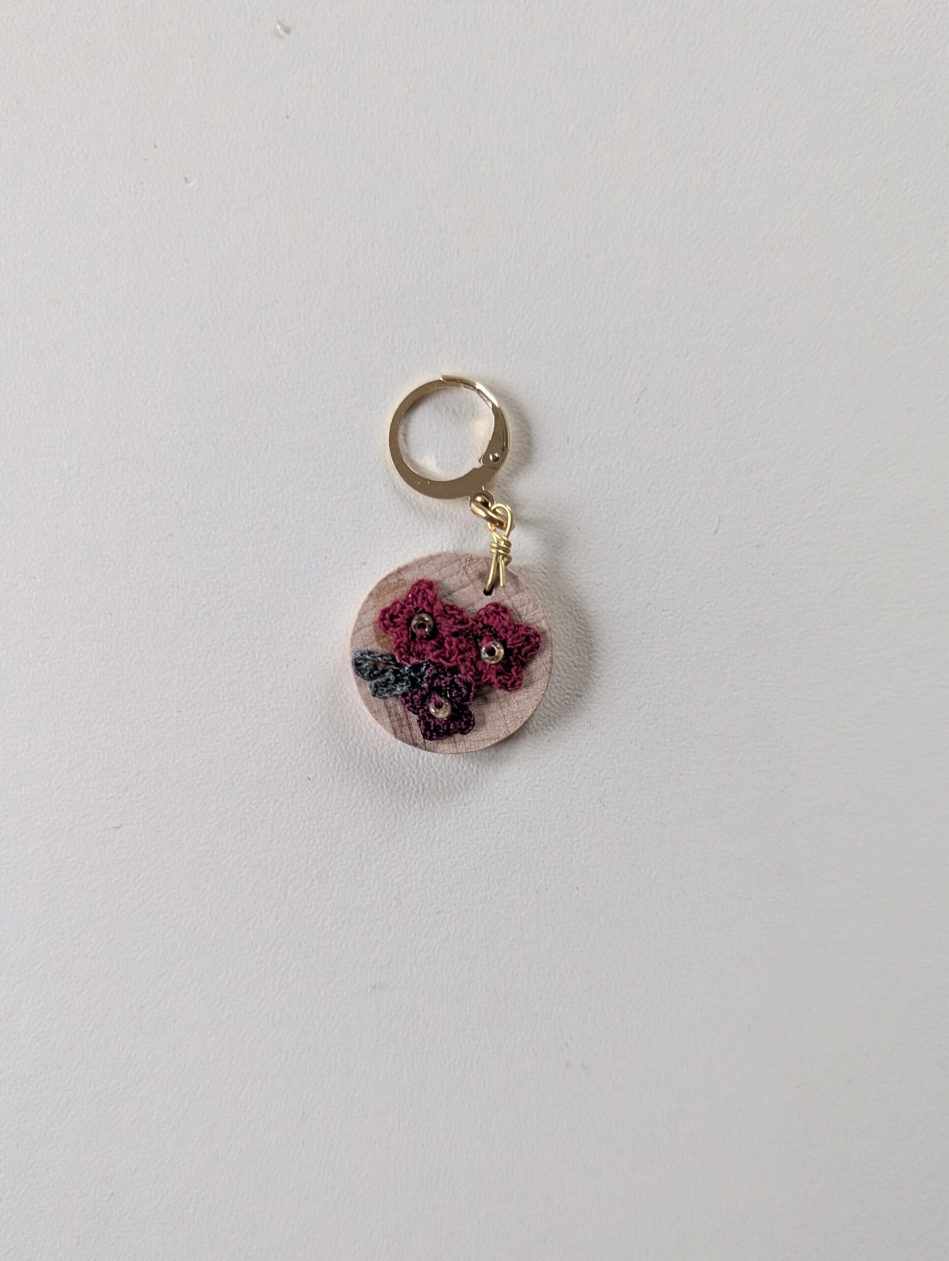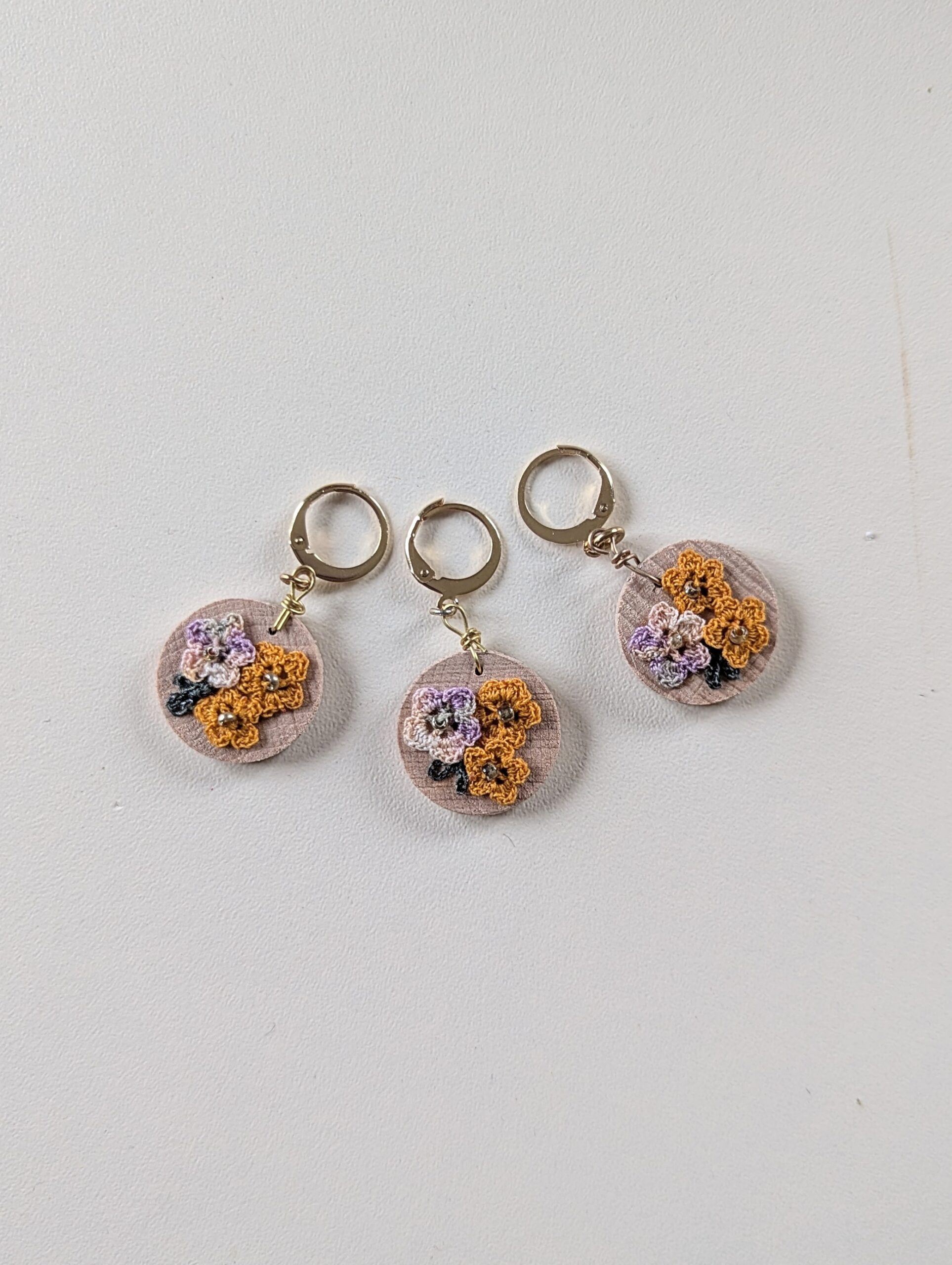 Cette collection de marqueurs de mailles en bois est construite autour d’un travail minutieux : une chute de bois sur lequel est collé une composition petites fleurs réalisées en micro crochet.