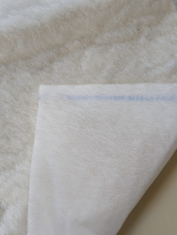 Facile à poser : il se colle simplement au fer (côté granuleux vers l’envers du tissu), ne glisse pas au moment de la couture et plisse moins qu’un molleton libre.