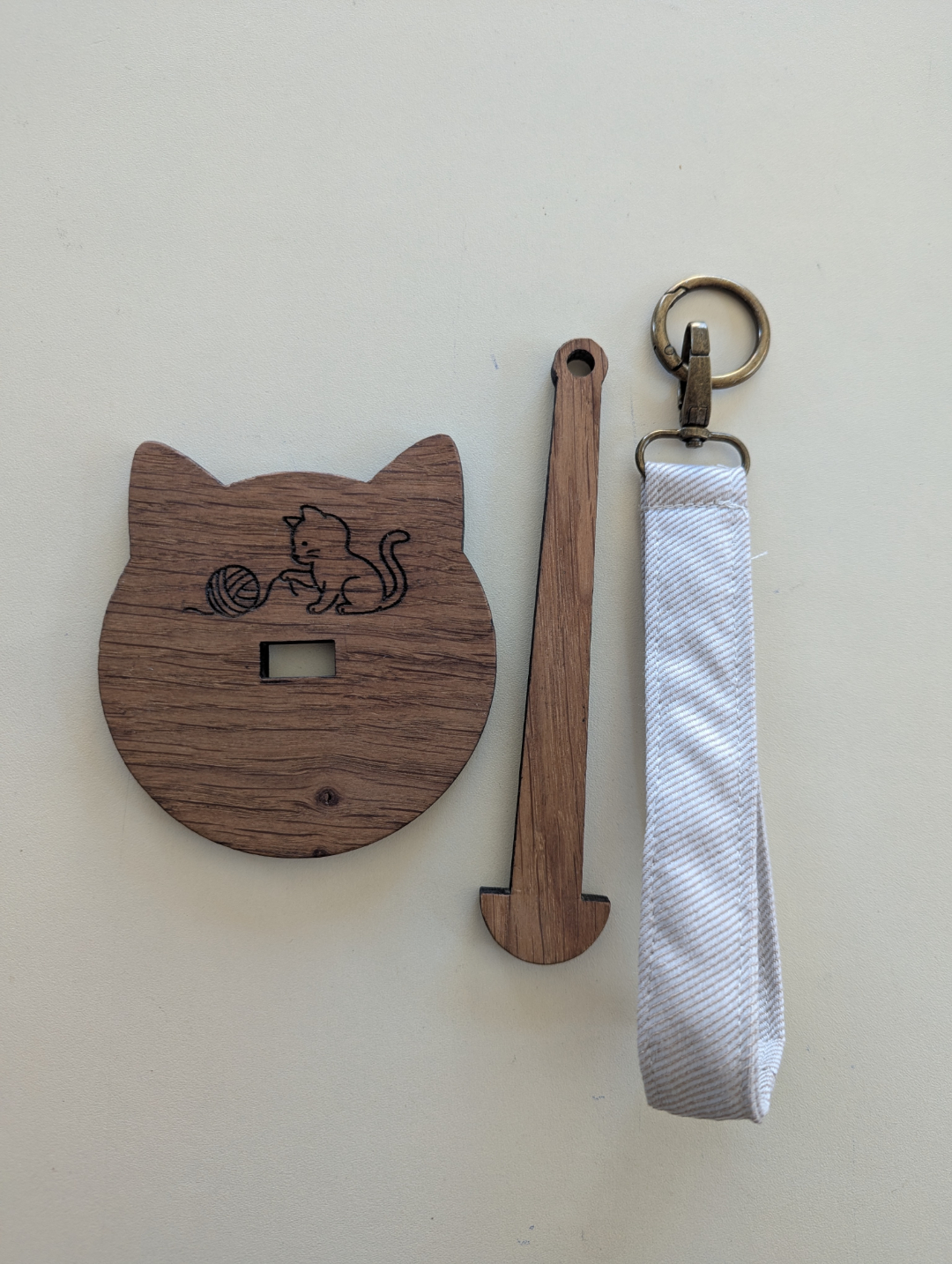 Ce modèle est une version prototype : Le motif chat est légèrement différent de celui proposée sur la version finale, et la finition est réalisée avec un vernis (au lieu de l’huile utilisée habituellement).