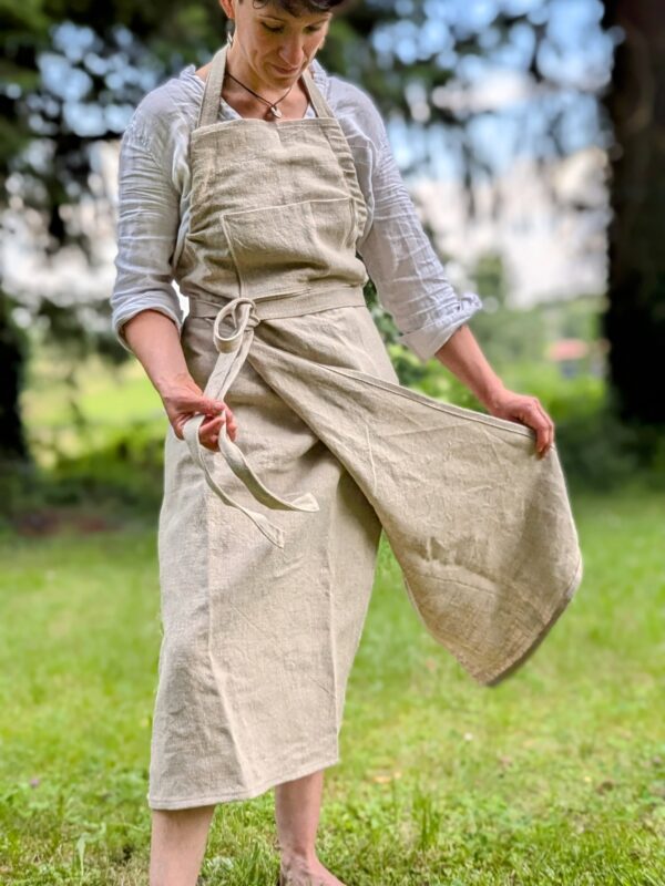 Liberté totale de mouvement : les deux pans du tablier fendu pour potier permettent au tissu de se répartir naturellement de chaque côté lorsque vous êtes assis(e), pour un confort maximal.